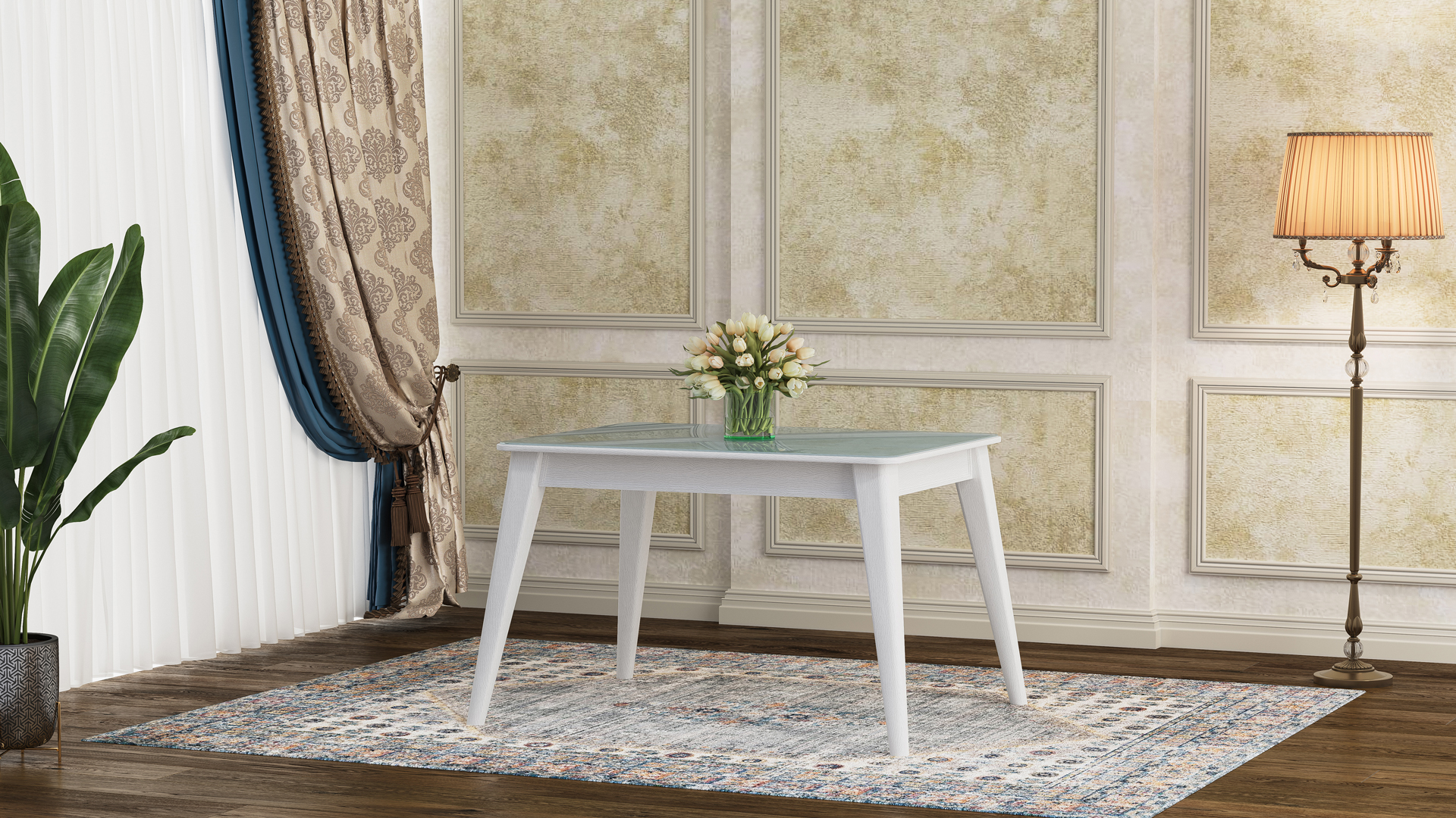 تُطلَى الطاولة بألوان بولي يوريثان مقاومة للماء جرى تجفيفها في أفران خاصة لزيادة متانة اللون بشكل كبير. وهي متوفرة بعشرة ألوان جذابة ومتنوعة تشمل الذهبي، اللؤلؤي، البيج، الجوزي، اللون الطبيعي، الأبيض، بالإضافة إلى الألوان المعدنية المطلية مثل الفضي، الرمادي الداكن، النحاسي (الروز غولد)، والذهبي. كما يمكن طلب المنتج بلون خاص يتناسب مع ديكور المساحة المطلوبة. أما الألوان المعدنية المطلية، فيُغطى سطح الطاولة بطبقة معدنية لامعة تضفي مظهرًا براقًا وتحمي المنتج من التآكل والخدش، ما يزيد من متانته.