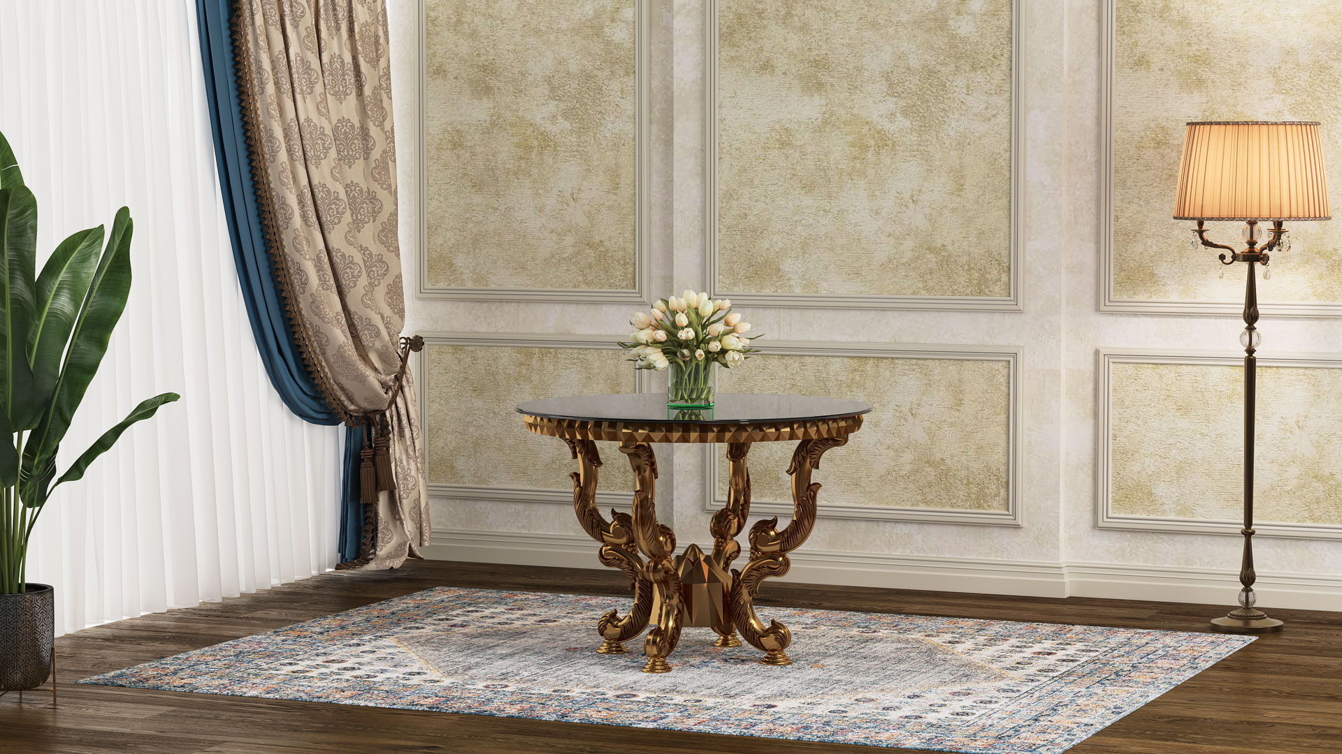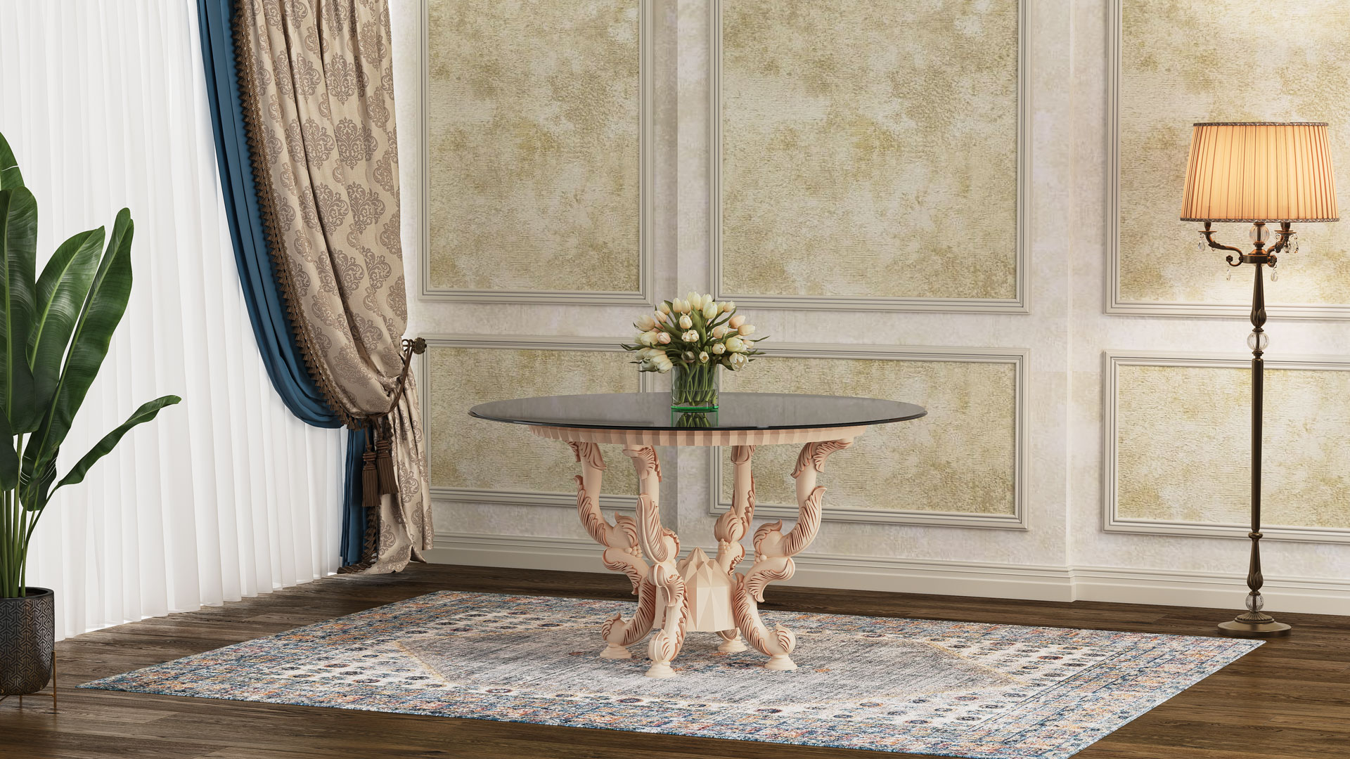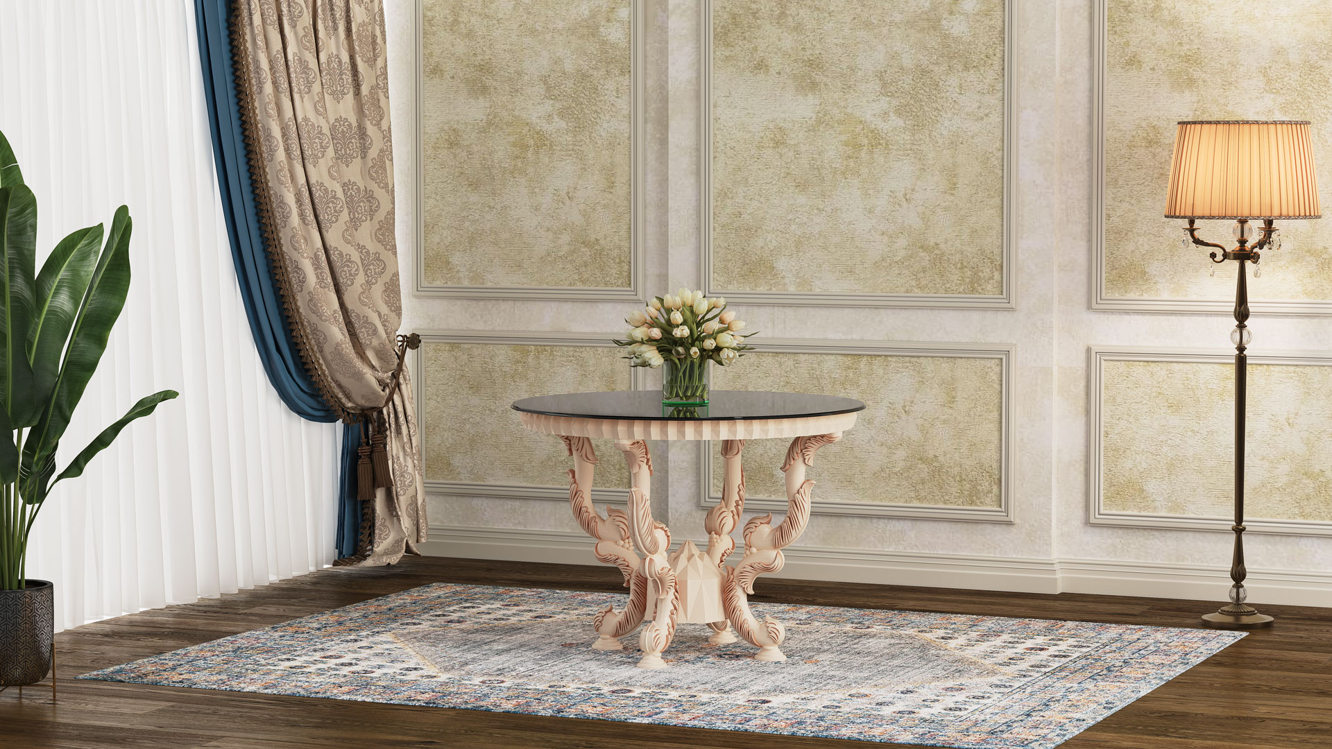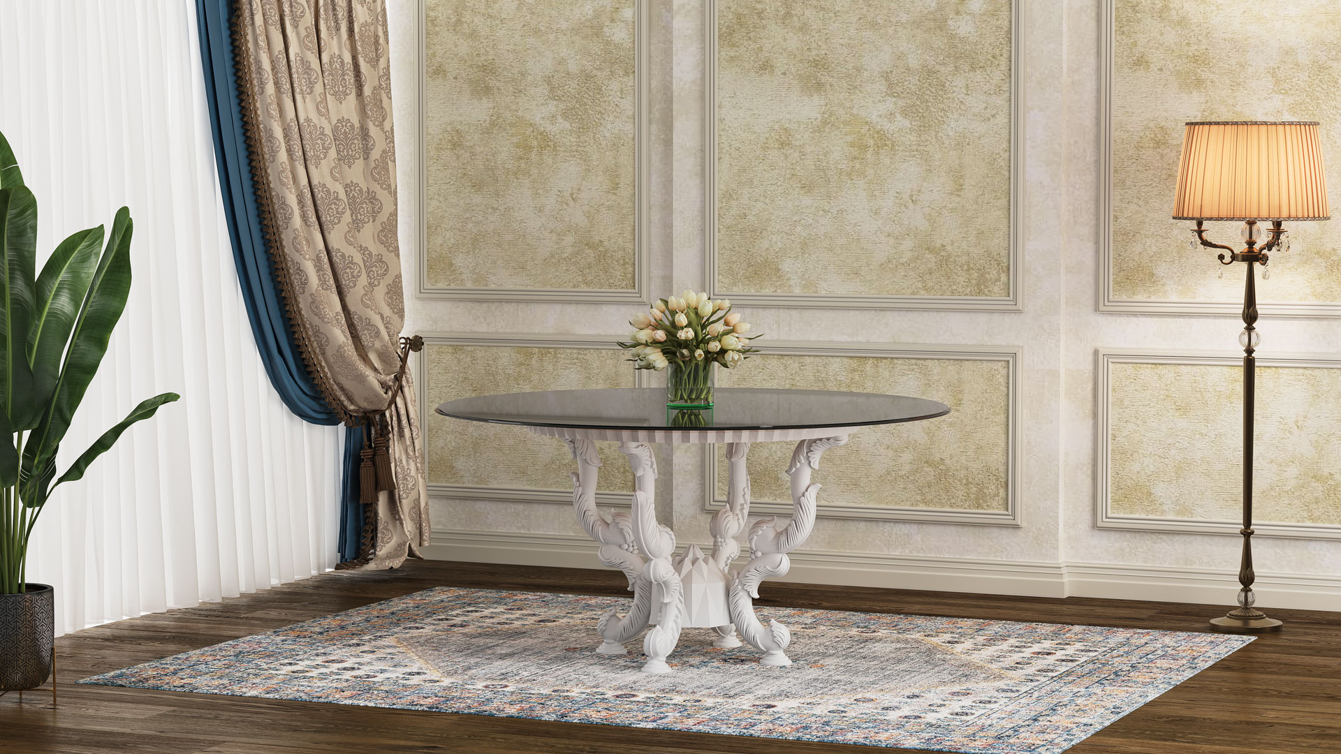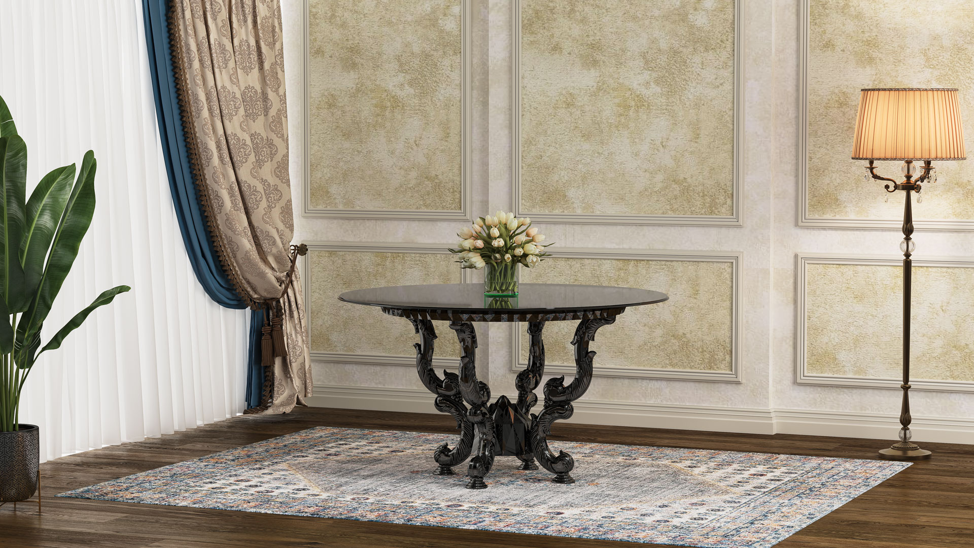طاولة بوليمر دياموند قطعة فريدة تجذب الأنظار منذ اللحظة الأولى بتصميمها البديع وتفاصيلها الدقيقة. تمنح الأرجل المنحوتة والمعقدة، المستوحاة من الفن الكلاسيكي، أي مساحة حضورًا مهيبًا وفخمًا.