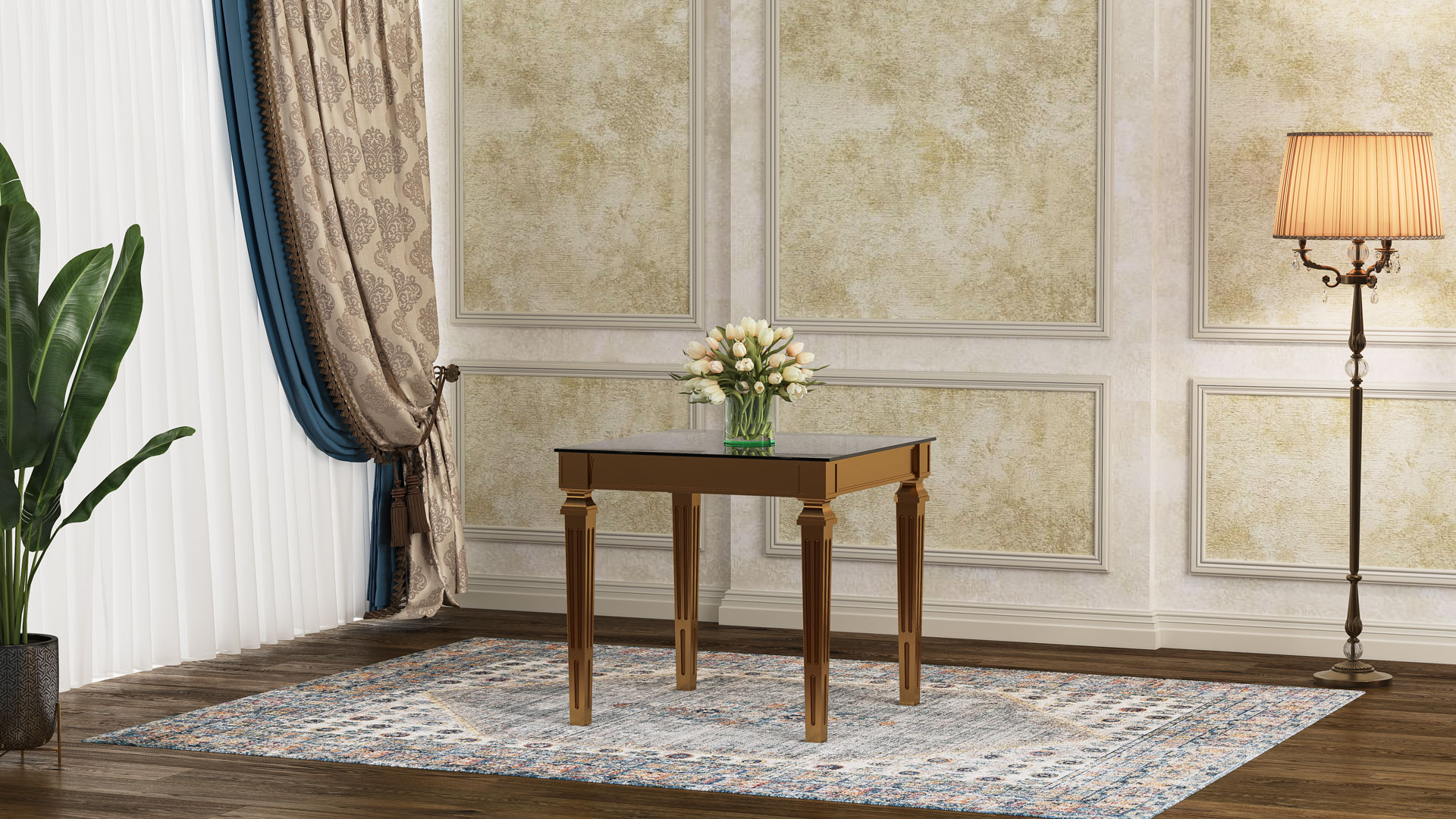 تُطلَى الطاولة بألوان بولي يوريثان مقاومة للماء جرى تجفيفها في أفران خاصة لزيادة متانة اللون بشكل كبير. وهي متوفرة بعشرة ألوان جذابة ومتنوعة تشمل الذهبي، اللؤلؤي، البيج، الجوزي، اللون الطبيعي، الأبيض، بالإضافة إلى الألوان المعدنية المطلية مثل الفضي، الرمادي الداكن، النحاسي (الروز غولد)، والذهبي. كما يمكن طلب المنتج بلون خاص يتناسب مع ديكور المساحة المطلوبة. أما الألوان المعدنية المطلية، فيُغطى سطح الطاولة بطبقة معدنية لامعة تضفي مظهرًا براقًا وتحمي المنتج من التآكل والخدش، ما يزيد من متانته.
