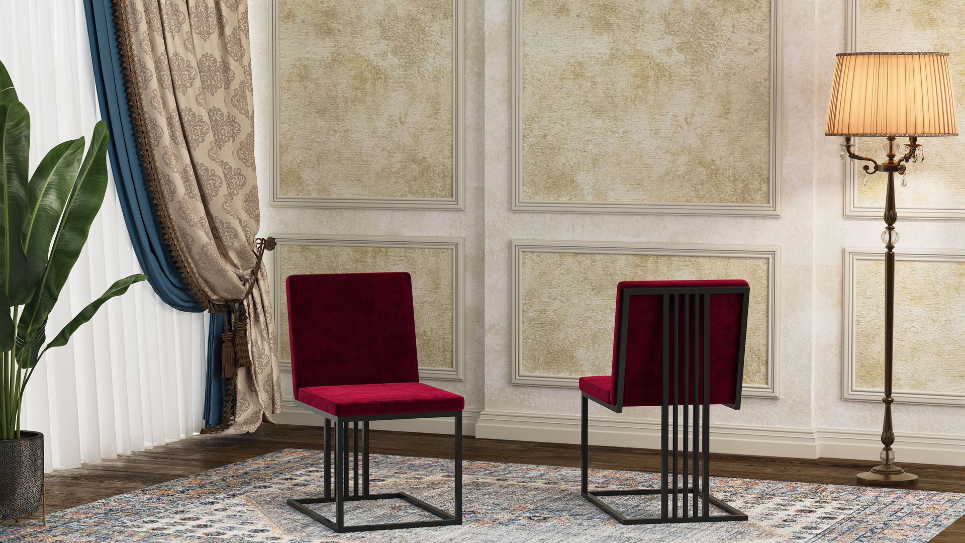 هذا يجعله يضفي طابعًا مميزًا دون إحداث ازدحام بصري. أرجل الكرسي المربعة وإطاره المعدني البسيط يجعلان منه خيارًا مثاليًا للأماكن المزدحمة مثل لوبيات الفنادق الفاخرة، قاعات الاستقبال الحديثة أو غرف المعيشة الكلاسيكية. كما أن النسيج الناعم والمقعد المريح يتيحان استخدامًا طويل الأمد بارتياح كامل.