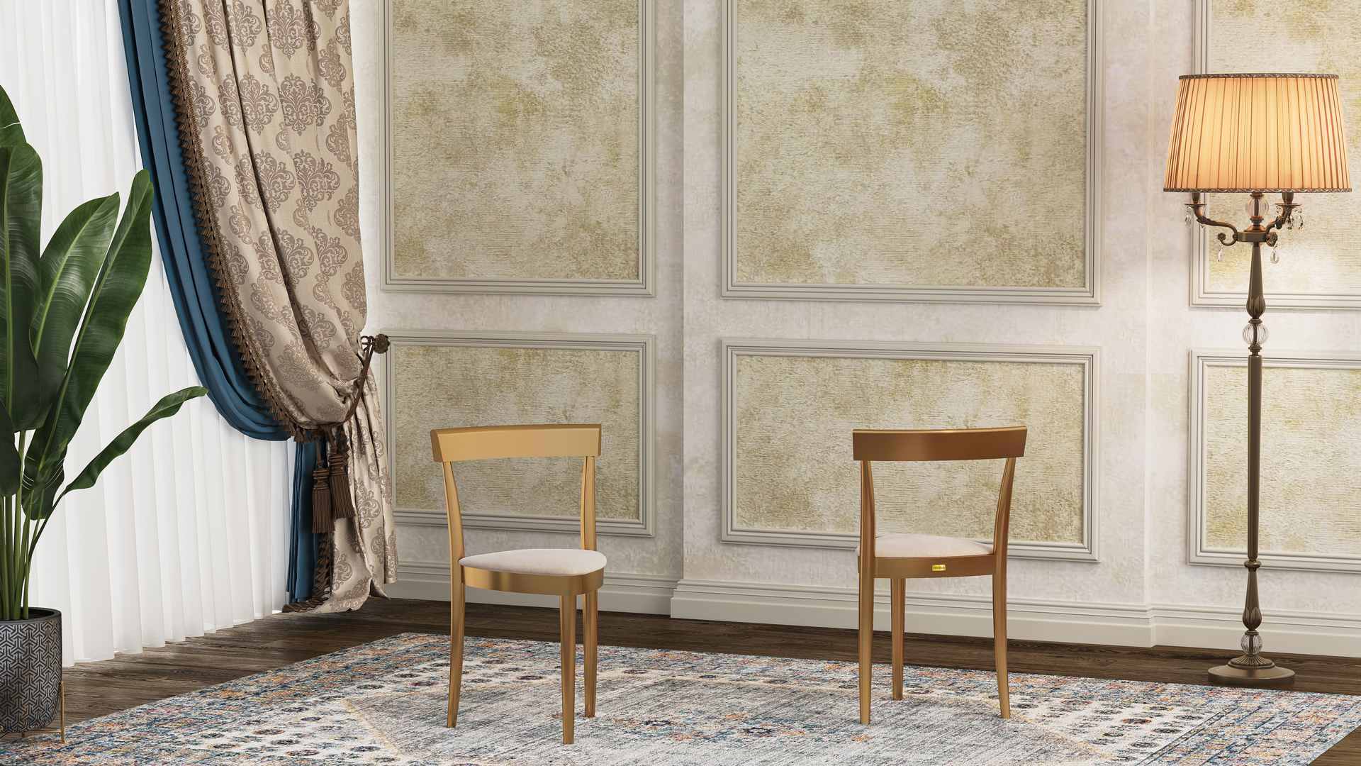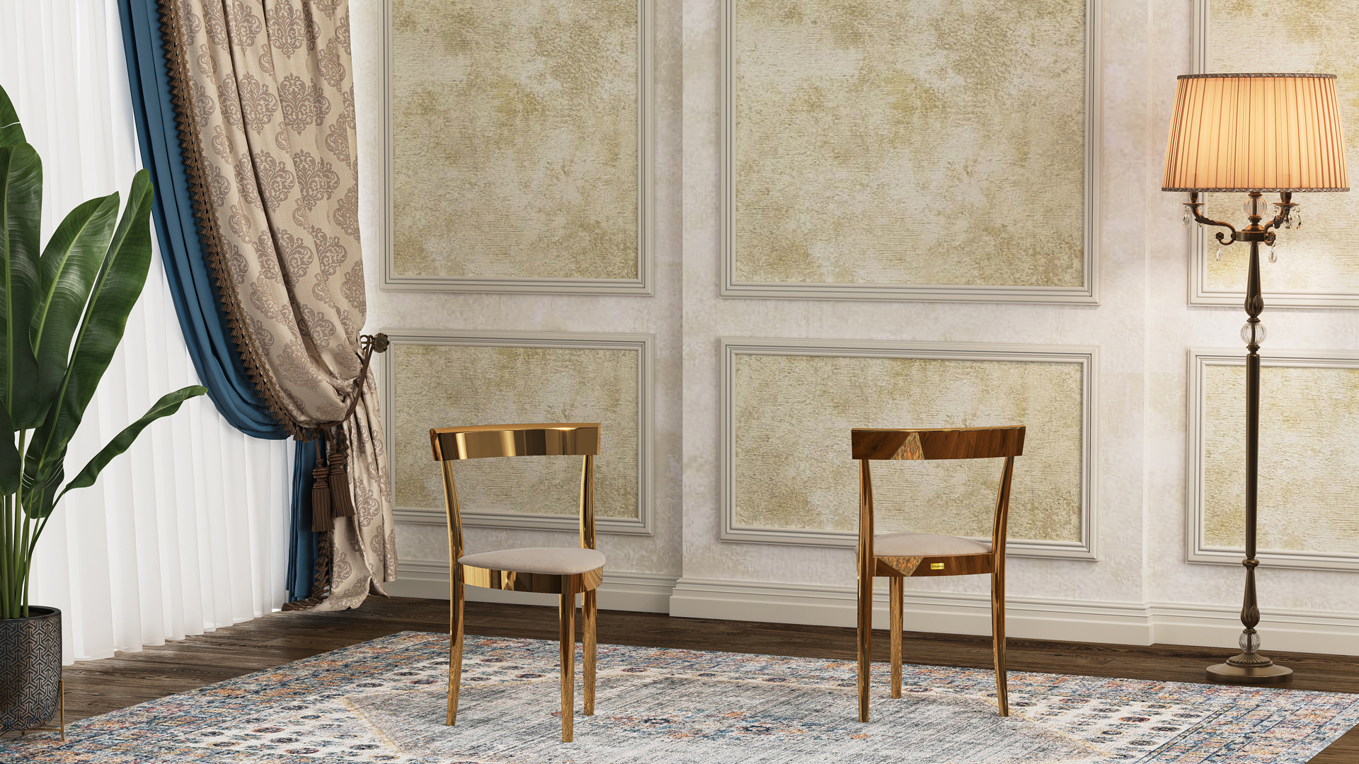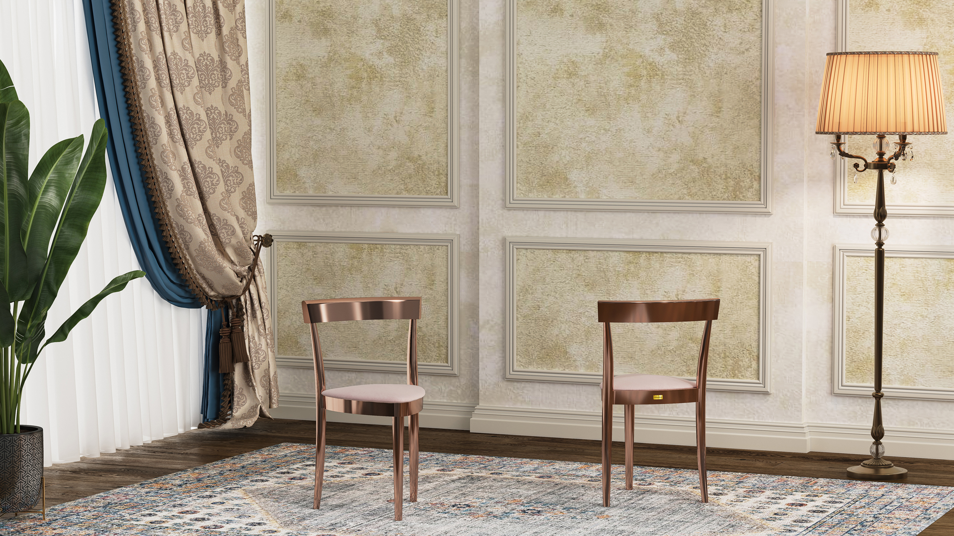 تُستخدم في هذا الكرسي ألوان بولي يوريثان مقاومة للماء، وقد تم تجفيفها في أفران خاصة لزيادة ثبات اللون بشكل ملحوظ. يُطرح الكرسي بعشرة ألوان جذابة ومتنوعة تشمل: الذهبي، اللؤلؤي، البيج، الجوزي، اللون الطبيعي، الأبيض، إضافةً إلى الألوان المطلية بالكهرباء مثل الفضي، الرمادي الداكن، النحاسي (الروز غولد)، والذهبي. كما يمكن طلب المنتج باللون المخصّص ليتناسب مع ديكور المكان. في النسخ المطلية بالكهرباء، تُغطّى سطح الكرسي بطبقة معدنية تمنحه لمعانًا أنيقًا، وتوفّر في الوقت نفسه حماية إضافية ضد التآكل والخدوش، مما يزيد من متانته.