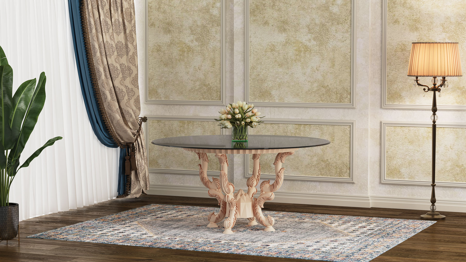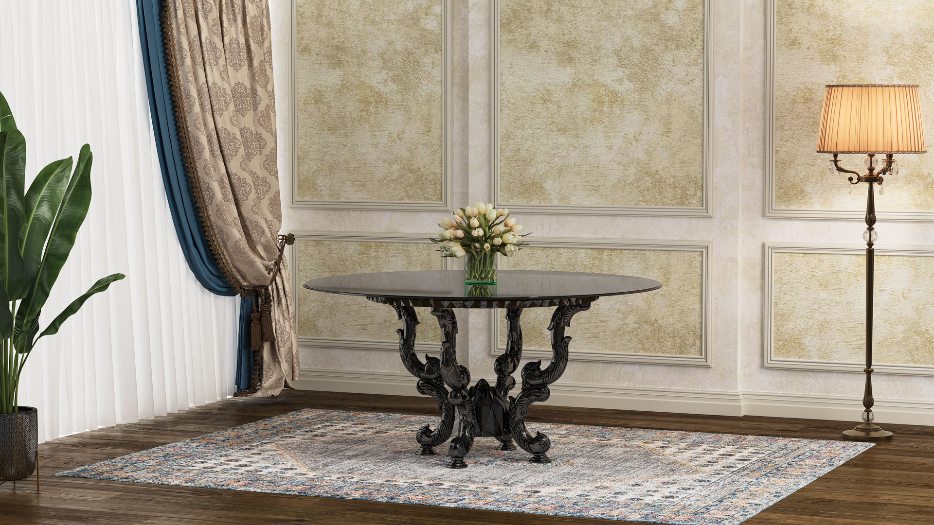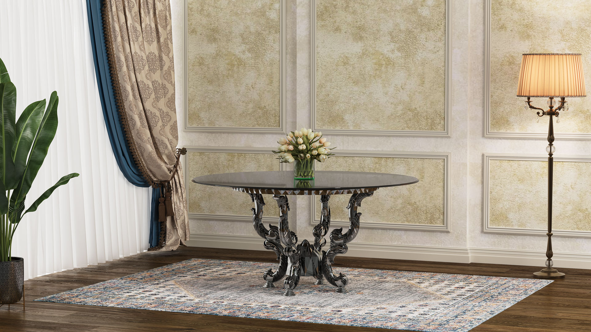 میز تالاری دیاموند هو میز فريد من نوعه، يلفت الأنظار من النظرة الأولى بتصميمه الرائع و تفاصيله الدقيقة. القواعد المعقدة والمجسمة، المستوحاة من الفن الكلاسيكي، تضيف للمساحة جلالاً و فخامة لا مثيل لها.